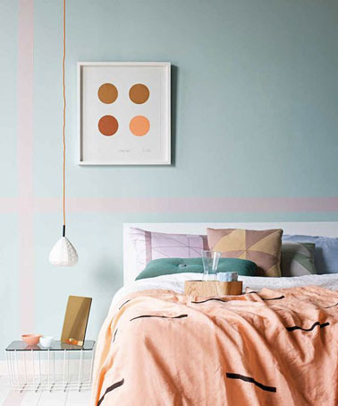 On craque à coup sûr pour la jolie déco pleine de fraicheur de cette chambre parentale ! Avec un mur peint de couleur bleu vert traversé de deux lignes rose pastel, une parure de draps et de jolis coussins de multiples couleurs pastel, voilà une pièce raffinée et colorée où il est agréable de se reposer.