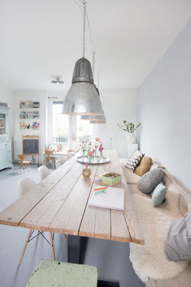 Douceur absolue dans cette belle salle à manger décorée de luminaires industriels et d’une table en bois pour une ambiance scandinave 100% reposante. Des touches de couleurs pastel données par les coussins et la déco soulignent la pureté de cette pièce conviviale et lumineuse.