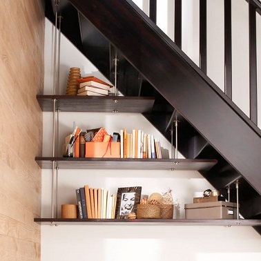Ranger sur des étagères suspendues sous escalier, astucieux !