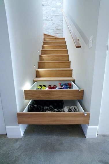 Un rangement de chaussures sous les marches de l’escalier, une solution intelligente pour entreposer les souliers.
