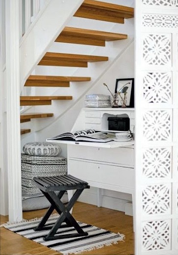 Aménager un petit coin bureau une bonne astuce rangements sous l’escalier pour gagner de l’espace dans la maison.
