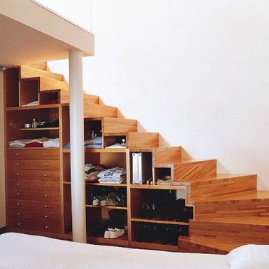 Une pléiade de placards verticaux composent le dessous de cet escalier. Une multitude de solutions rangements pratiques et spacieux pour entreposer un bon nombre d’affaires. Les grands casiers sont aménageables en petites penderies grâce à la pose d’une simple barre et quelques cintres tandis que les box rectangulaires du bas agrémentés de bannettes deviennent aisément des tiroirs. Sur mesure, cet escalier original permet d’ajouter un coin rangement sans pour autant perdre de la surface. Source : Pinterest