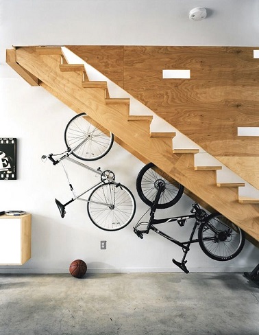 Originale solution pour gagner de la place dans les petits appartements, ces suspensions pour vélo occupent l’espace sous l’escalier sans grignoter de la surface au sol. Pratique pour les sportifs qui n’ont pas de garage ou pour les parents d’enfants actifs sur deux roues, ce système de rangement sous escalier constitue une réelle bonne idée pour entreposer des objets encombrants ! Source : inthralld.com