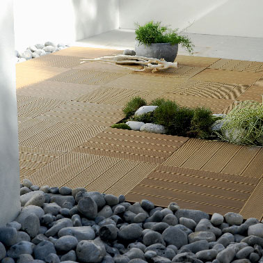 Il a l’aspect du bois, se pose facilement, se scie comme le bois, nécessite peu d’entretien, il résiste aux intempéries et aux vilains insectes, le bois composite est une alternative aux essences exotiques, teck, ipé… pour le sol de la terrasse. Disponible en lames ou dalles à assembler à l’aide de vis, il est aisé d’aménager sa terrasse version zen en alternant espace bois, carrés de verdure ou de gazon synthétique encore plus pratique pour une terrasse en ville et d’y intégrer des carrés de galets gris ou blanc lors de son installation. Dalles Kyoto en bois composite, dim : 50 cm x 50 cm, Epaisseur 50 mm. Prix : 13.90 € Chez Leroy Merlin.