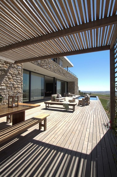 Cette terrasse tout de bois vêtue est à couper le souffle. Dominant le paysage , la terrasse semble interminable grâce aux lames de bois qui composent son revêtement. Pour accentuer le look boisé et plein de charme de cet espace extérieur, différents meubles dans un bois plus clair sont disposés de part et d’autres et une grande pergola filtre les rayons du soleil. Dans un angle, une sublime piscine est encastrée au bout de la terrasse en bois. Source : cjwho