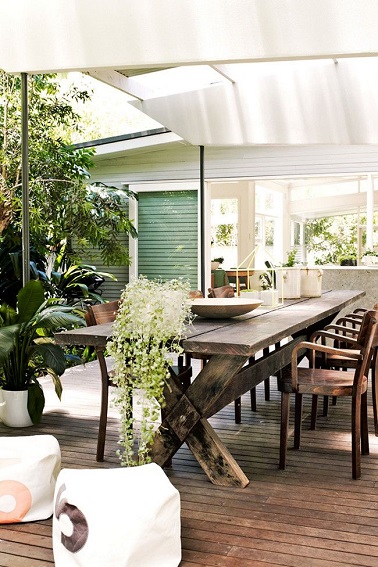 Ambiance chic sur la terrasse de cette maison de campagne australienne. De fines lames de bois composent le sol dans une couleur pleine de nuances, en complément une table en bois brut donne du caractère à toute la terrasse. Pour un peu plus de douceur, des chaises aux courbes raffinées et les accessoires déco blancs tels que les poufs carrés ou encore la vaisselle se chargent d’illuminer tout l’extérieur. Source : mademoiselle claudine.leblog