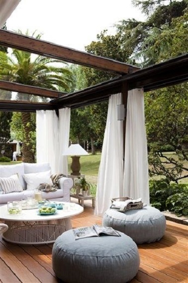 Quoi de mieux que du bois et du mobilier moelleux pour un confort optimal sur la terrasse ! Le sol en teck de cette terrasse laisse tout le loisir d’agrémenter la déco à sa guise. Les deux poufs ronds et gris font écho à la table basse très design en bois peint en blanc. Pour finir et renforcer l’esprit bois, une pergola surplombe ce salon de jardin élégant dans lequel on aurait bien envie de se poser lors d’une belle après-midi ensoleillée ! Source : flemarie