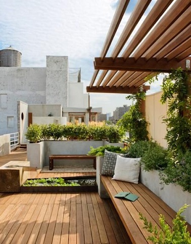 Loin de la jungle urbaine et près du ciel, qui aurait pu soupçonner que se trouvait une terrasse si accueillante et dépaysante ! Cette terrasse faite de lames en teck, propose un endroit plein de verdure à l’aide de murets bacs à fleurs et de plantes grimpantes entourant les poteaux de la petite pergola. En teck également, le long banc invite à se détendre en se laissant bercer par la fontaine en pierre et acier design qui se fond dans le décor vert et nature de cette terrasse de ville. Source : remodelista