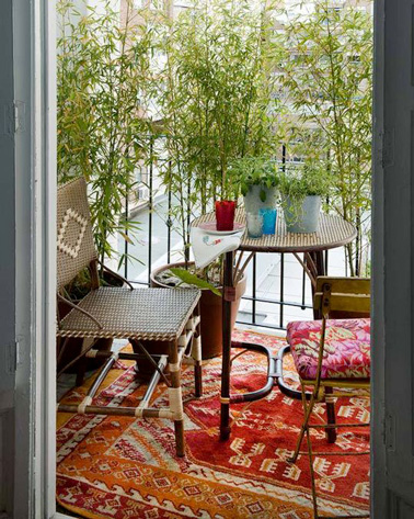 Pour réaliser un brise vue 100% végétal, utiliser des bambous c’est une super idée ! L’avantage c’est que cette plante pousse très rapidement en hauteur mais elle ne vous prive pas de la luminosité. Pratique ! On ajoute un tapis aux motifs colorés et un mobilier de jardin en rotin et on obtient un beau balcon accueillant.