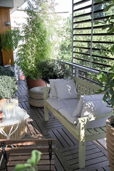 Dans cette déco de balcon, le brise vue métallique, un grand bambou en pot et quelques plantes vertes s’allient judicieusement pour protéger le petit espace extérieur des regards. Un aménagement de balcon nature qui incite à se détendre avec un sol recouvert de dalles en teck et de coussins douillets sur le banc de jardin.