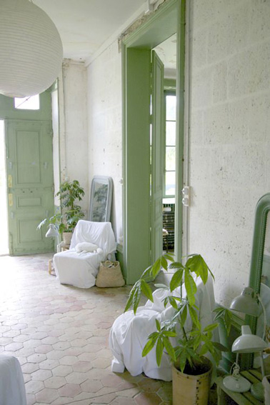 Pour donner un coup de peps à l’entrée de cette maison ancienne où les tommettes sont à l’honneur, on a misé sur une peinture couleur vert d’eau et des objets de récup pour illuminer et dynamiser la pièce. Le cadre du grand miroir est peint en gris clair et les vieux fauteuils drapés de coton blanc. Voilà une déco aux couleurs printanières facile à reproduire pour rajeunir votre entrée.