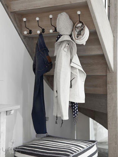 Quand on ne sait pas où disposer le porte-manteau dans l’entrée, aménager un rangement sous escalier pour y remédier c’est futé ! Ici, on a accroché une série de porte-manteaux fixés sous les marches et un pouf pour se déchausser tranquille. Un petit espace sous l’escalier pour faire de la place dans l’entrée et préserver la déco du désordre !