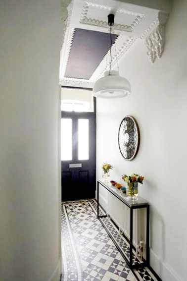 Pour camoufler le radiateur pas très esthétique dans l’entrée, après lui avoir donner une coup de peinture radiateur de la couleur que les murs, l’astuce c’est le cache radiateur muni d’un plateau de verre qui devient console pour disposer bougies et petits bouquets de fleurs. Dans ce couloir d’entrée au style rétro, le sol en carreaux de ciment ainsi que les moulures au plafond donnent du caractère à la déco, le tout souligné par un rectangle de peinture couleur prune au plafond qui fait un clin d’oeil à la couleur de la porte d’entrée.
