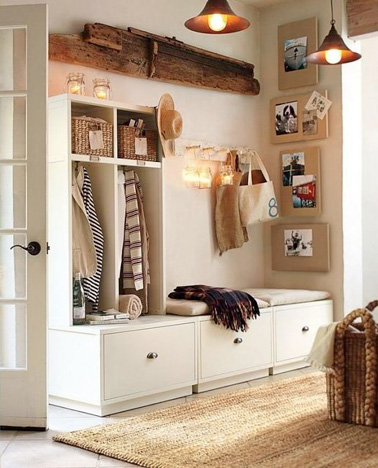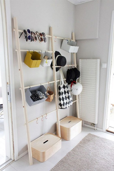 Pour une entrée 100% personnalisée, l’idéal c’est de créer soi-même un petit espace de rangement. Pour réaliser celui-ci, il vous suffit d’assembler des tringles de bois pour obtenir une penderie en échelle et des rangements pratiques. Disposez des boites en bois pour ranger les chaussures au pied de la penderie et le tour est joué. voilà une déco d’entrée réalisée avec quelques bricoles et ultra stylée.