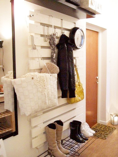 L’entrée se doit d’être fonctionnelle, et c’est le cas ici. Une palette bois fixée sur le mur se transforme en penderie grâce a des crochets suspendus pour ranger sacs, parapluies et manteaux ! Avec un range-chaussures qui trouve sa place sous la penderie, on ne manque pas de rangements et la déco est assurée ! Voilà une idée que vous pourrez facilement reproduire chez vous à pas cher pour un maxi effet dans l’entrée.