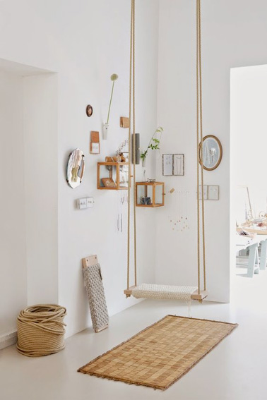 Voila une entrée pas banale ! Des éléments déco, miroirs, cadres photos, cubes étagères habillent les murs blancs et une balançoire en bois trône fièrement au milieu du couloir. Un beau tapis en jonc de mer sur le sol beige en font une entrée tendance et unique aux tons naturels.