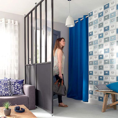 Pour délimiter l’espace de l’entrée dans un petit appartement, y aménager une cloison amovible pour séparer l’entrée du séjour c’est une bonne idée ! Dans cette entrée où les murs sont tapissés d’un papier-peint imprimé de casiers en trompe l’oeil, la cloison amovible sert de rupture entre le hall et le salon. Un rideau bleu roi rappelant les coussins du salon camoufle un espace de rangement idéal pour ranger manteaux et chaussures.