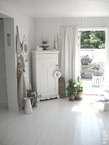 La douceur et l’élégance règnent dans cette entrée joliment et finement décorée. Lambris bois sur les murs, parquet blanc au sol, meuble ancien, clin d’oeil à la Provence avec un pied de lavande en pot et rideaux en lin, s’harmonisent dans cette entrée dans une atmosphère délicate et reposante. Une déco qui ne manque pas de charme et qui séduira à tous les coups.