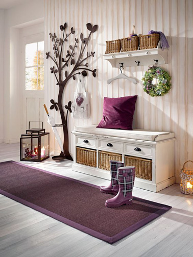 L’entrée de cette maison respire la bonne humeur. Avec la couleur prune en petites touches déco et des murs en lambris PVC, ce hall d’entrée accueille un meuble bas équipé de paniers en osier pour ranger les chaussures. Le porte-manteau en forme d’arbre apporte une note d’humour tandis que le photophore participe à créer une ambiance cocooning.