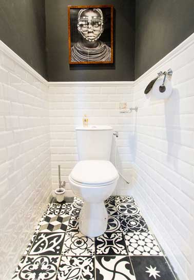 Une belle décoration des WC en carrelage noir et blanc a été réalisé dans ces toilettes à l’esprit artistique. Les murs en carrelage blanc agrandissent la pièce et les carreaux de ciment dépareillés au sol dessinent un patchwork de couleur noir et blanc qui rappel les tons du tableau suspendu. L’option de peindre le plafond et le haut des murs en gris anthracite a été retenu pour ajouter de l’intimité à ce lieu très privé.