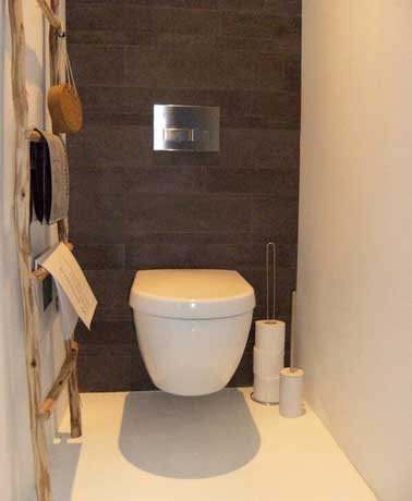 Belle inspiration zen dans ces toilettes à la déco très simple autour d’un bloc WC suspendu. Les murs et le sol sont en peinture de couleur blanche et l’habillage en carreaux de ciment de couleur gris foncée. Sur cette base bicolore on ajoute une échelle en bois flottée claire comme meuble de rangement. Et la décoration des toilettes prend desuite une note écolo.