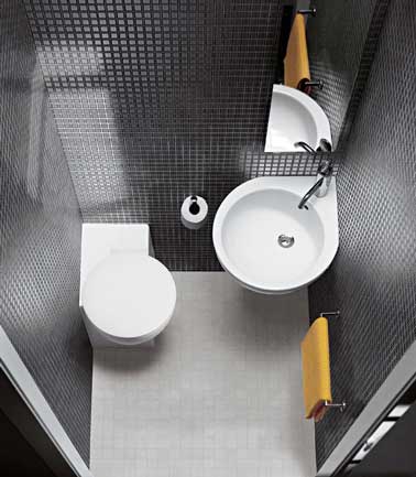 Mini coin WC mais maxi effet déco graphique pour cette décoration contemporaine très réussie. Le carrelage noir posé sur tous les murs des toilettes crée un beau contraste avec les carreaux gris du sol. Encore une astuce déco pour agrandir l’espace : poser un lavabo en angle et placer un miroir au dessus pour agrandir la pièce en trompe l’oeil.