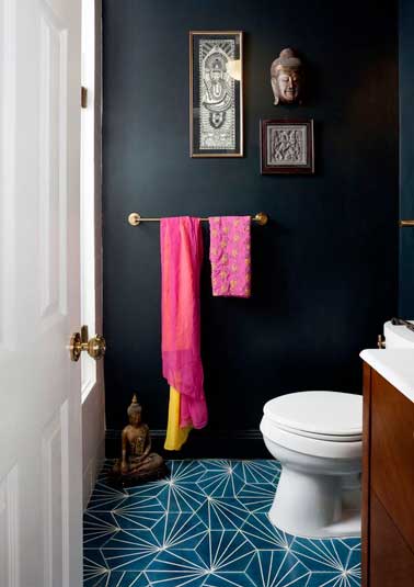 Installez une décoration nomade dans les toilettes pourquoi pas ? Les WC s’ouvrent sur un mur en peinture de couleur noire sur lequel se détachent parfaitement des éléments de décoration éthniques. Ici deux tableaux en bois indiens et des statues de divinités. Sur le sol un beau carrelage WC bleu profond aux motifs graphiques pour la touche chic.