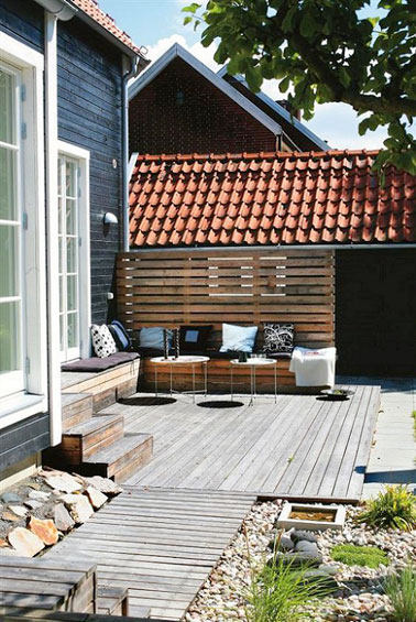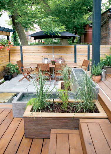 Sur cette terrasse en bois joliment aménagée sur deux niveaux, la table en teck protégée du voisinage par un brise-vue en pin prend ses aises sur un grand carré recouvert de dalles de béton. Matériau sobre repris pour construire les deux grands bassins d’eau en circuit fermé qui se chargent d’apporter la fraîcheur aux heures chaudes et de planter le décor d’une terrasse zen. Un aménagement ponctué par la verdure pour une déco extérieur coquette et intime à souhait !