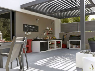 Quand on a de la place sur la terrasse, quel bonheur d’y aménager une cuisine d’été sous le patio ! Barbecues, four à pizza, évier, placards à vaisselle, tout est à portée de la table de jardin pour déjeuner sur la terrasse à l’abris du parasol.