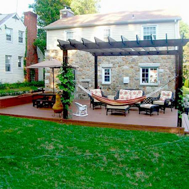 Derrière une maison en pierre, une terrasse en bois est aménagée sur toute la largeur de la façade pour installer le coin détente et celui des repas. Sous la pergola, une déco cosy organisée autour du salon de jardin en résine tressée à l’allure rétro et l’indispensable hamac. Un peu décalée, la table de jardin est directement accessible depuis la cuisine.