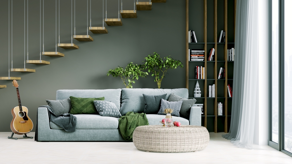 Un mur d’accent permet de dynamiser l’espace sans l’alourdir. Choisissez une couleur plus soutenue que le reste de la pièce. Les tons terracotta, vert sauge ou bleu profond sont très tendance. Cette technique apporte du caractère et structure visuellement le salon.