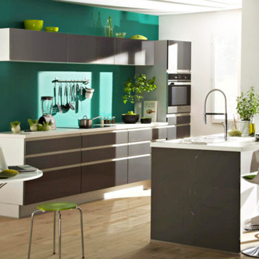 Le vert émeraude, a été élue couleur de l’année 2013  par Pantone. Si vous craquez pour cette couleur lumineuse dans la cuisine , un gris, un taupe pour le mobilier fera merveille. Vous pouvez complèter cette palette de couleur par un plan de travail en bois ou granit finition clair. Cuisine réf Platine chez But.