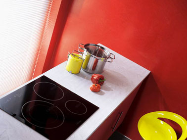 Vous avez une petite cuisine ? Pour en faire un espace convivial osez les couleurs fortes ! Ici, mur et portes du bloc de cuisson sont peint dans un rouge franc renforcé par le jaune vif du tabouret de bar. Le plan de travail blanc grisé et la plaque vitrocéramique noir jouent la neutralité pour mieux mettre en valeur les couleurs primaires. Effet béton ciré Réf. Loft chez Leroy Merlin