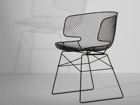 Chaise « Arkys » design Jean Marie Massaud. Structure en acier verni et coque en grillage métallique verni. L 62 P 55 H 78.5 cm. Marque : Eumenes. Prix : 230 €