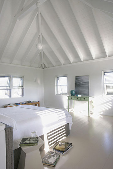 Splendide architecture du toit pour une chambre blanche installée sous les combles ! Avec une déco toute de blanc vêtue une chambre zen avec une peinture mate d’un blanc pur sur les murs et les poutres et un parquet blanc qui subliment la tête de lit et le banc en bois clair. Une ambiance lumineuse règne dans cette chambre sous combles où seule la coiffeuse repeinte en vert tendre s’aventure à ponctuer la chambre d’une touche de couleur.
