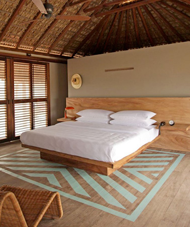 Dans une villa mexicaine, une magnifique chambre aménagée sous les combles. Une pièce au caractère unique avec sa déco réalisée en matériaux et couleurs naturels. Sur le parquet, le tapis vert d’eau peint dans des motifs géométriques apporte un note de fantaisie discrète à la chambre. Un style fait de bois et d’osier pour une atmosphère 100% vacances, idéale pour décompresser.