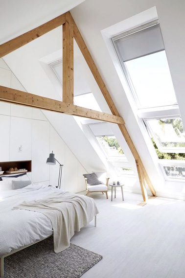 La poussière s’installe sous les combles ? Réhabilitez les pour en faire une jolie chambre, profitez de l’architecture de la pente sous toit et du jeux des belles poutres afin d’aménager une chambre sous comble de caractère à la déco charmante.