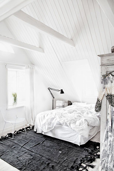 Toute autre ambiance déco dans cette chambre sous combles ! La peinture blanche du beau plafond en lambris et des poutres se prolonge sur les murs et le sol. Une déco ultra simple soulignée par le joli tapis en laine de coton gris anthracite et une lampe articulée de style industriel qui donnent du caractère à la chambre.