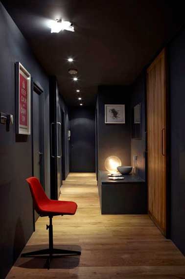 Le couloir sombre se fait cosy avec la peinture gris anthracite sur les murs et le plafond. Pour installer une déco théâtrale, l’espace est volontairement laissé sombre. Le sol en parquet doré, les spots encastrables au plafond et la lampe décorative ajoutent à eux seuls une note lumineuse. Un parti pris osé mais bien joué pour créer un effet clair obscur saisissant.