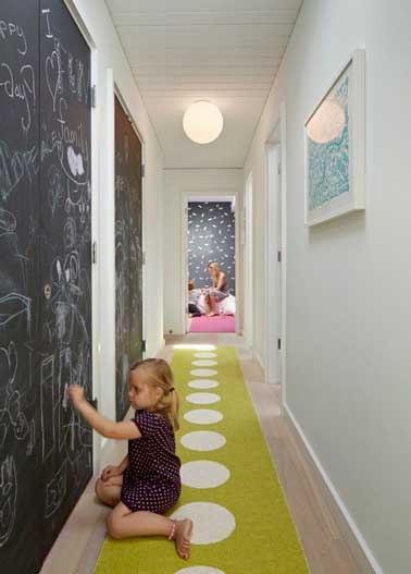 Avec de la peinture tableau noir sur les murs, le couloir devient un lieu de passage récréatif ! Bonne idée déco pour amuser les enfants dans cet espace étroit peint en blanc, la peinture noir recouvre les portes de placards ! Un long tapis vert lumineux donne une impression de profondeur, et un tableau rythme l’espace. Pour apporter de la lumière dans ce couloir sombre, le plafond et les murs sont recouverts d’une peinture blanche finition satin.