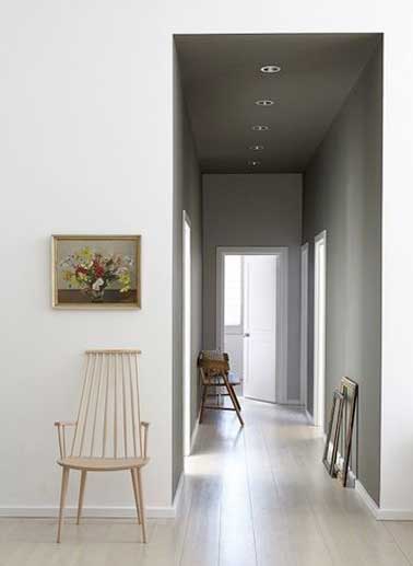 Jouer les duo gris perle et blanc en peinture pour la déco du couloir c’est le sans faute assuré ! Sur la photo, ce couloir étroit devient simplement chic avec la peinture. Des spots au plafond apportent de la lumière dans cet espace obscur et les encadrements des portes peints en blanc ajoutent élégance à la pièce. Pour la touche déco plusieurs beaux cadres anciens chinés et une chaise en bois sont posés contre le mur.