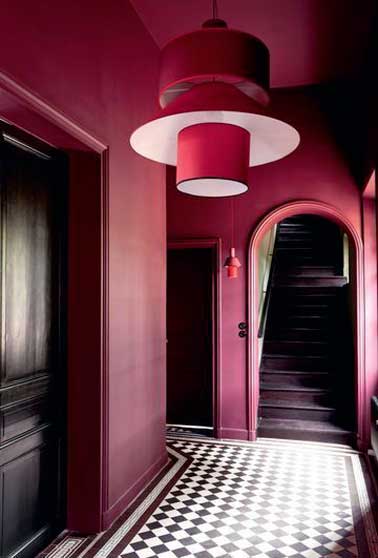 Plein feu sur la couleur framboise qui recouvre les murs de ce couloir de caractère. Une peinture rouge dans une teinte chaude intense, un luminaire design répondent au sol graphique et l’idée de peindre les portes en noir offre une déco bien cosy. Un parti pris de couleurs franches bienvenue pour habiller avec élégance ce grand couloir.
