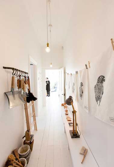 Un long couloir devient fonctionnel et déco avec une accumulation de récup bien pensée. Dans ce couloir aux murs et parquet blanc, les objets s’orchestrent de manière très organisée: des crochets en aciers font une suspension de rangement, des bancs en bois repeints en blanc et placés le long du mur créent un espace d’exposition, des dessins sur tissu accrochés avec des pinces à linge font la déco des murs…Le couloir devient un espace à vivre arty !