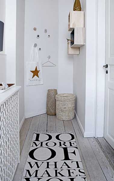 Dans cet espace étroit, la déco blanche s’associe à du bois clair pour une ambiance déco scandinave fraîche et lumineuse. Des casiers en bois et des paniers en osier clair fonctionnels, se répondent astucieusement contre un mur. Un tapis graphique et des boutons poignets de portes placés comme porte manteaux ajoutent une note colorée dans le couloir.