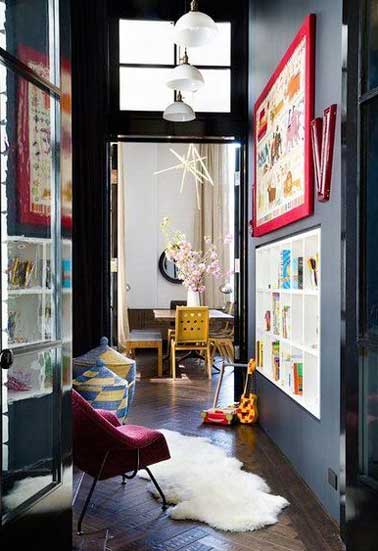 Aménagé comme une pièce à part entière, ce couloir est exploité en mini salle de jeux pour les enfants et coin lecture avec une bibliothèque encastrée dans le mur. L’aspect sombre de la couleur bleu nuit de la peinture est largement compensée par les étagères blanches et les multiples couleurs des livres et bibelots qui font de ce couloir un espace à la déco sympa autant pour les enfants et les grands.