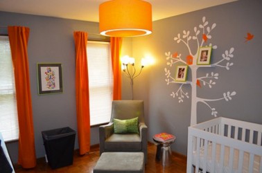 Le gris dans la chambre de bébé c’est super ! A l’automne, associez le gris à des rideaux orange pour renforcer le coté cocon de la pièce