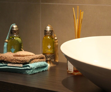 Dans la salle de bain, on range le linge de toilette blanc et sort les serviettes camel et vert tendre pour des réveils tout en douceur !