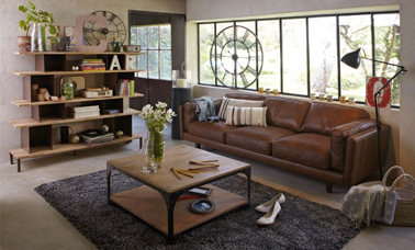 Canapé Brooklyn L 228 cm H 92 cm P 51 cm 1399 €.Table basse carrée industrielle Alliance L80 cm H 40 cm L 80 cm Prix : 329 €. Etagère 4 niveaux, L 150 cm H 135 cm P 35 cm Prix : 489 € Tapis gris 160x230cm Prix : 149 €