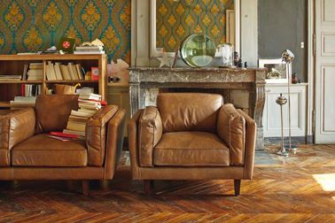 Une déco de salon qui s’orchestre autour de deux larges fauteuils en cuir vachette marron clair vieilli pour accentuer l’esprit rétro. Le papier peint, vintage lui aussi, renforce la volonté d’apporter à ce salon un style résolument vintage. Dimensions L 104 cm H 75 cm P 93 cm. Brooklyn Salon, 699 € le fauteuil.