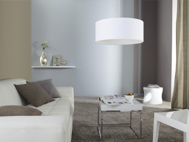 Pour un salon cosy et chaleureux à souhait, L’association d’une peinture grise et taupe est une valeur sûre. Dans ce salon, ces deux couleurs de peinture sont travaillées en un jeu de bandes verticales de largeurs différentes au milieu desquels s’invite un brun chaleureux. Pour faire écho à ces couleurs de peinture murale, une moquette brun taupe et les 3 coussins unis sur la banquette cuir couleur ivoire. Peinture satinée Luxens chez Leroy Merlin prix : 12.90 € le pot de 0.5L